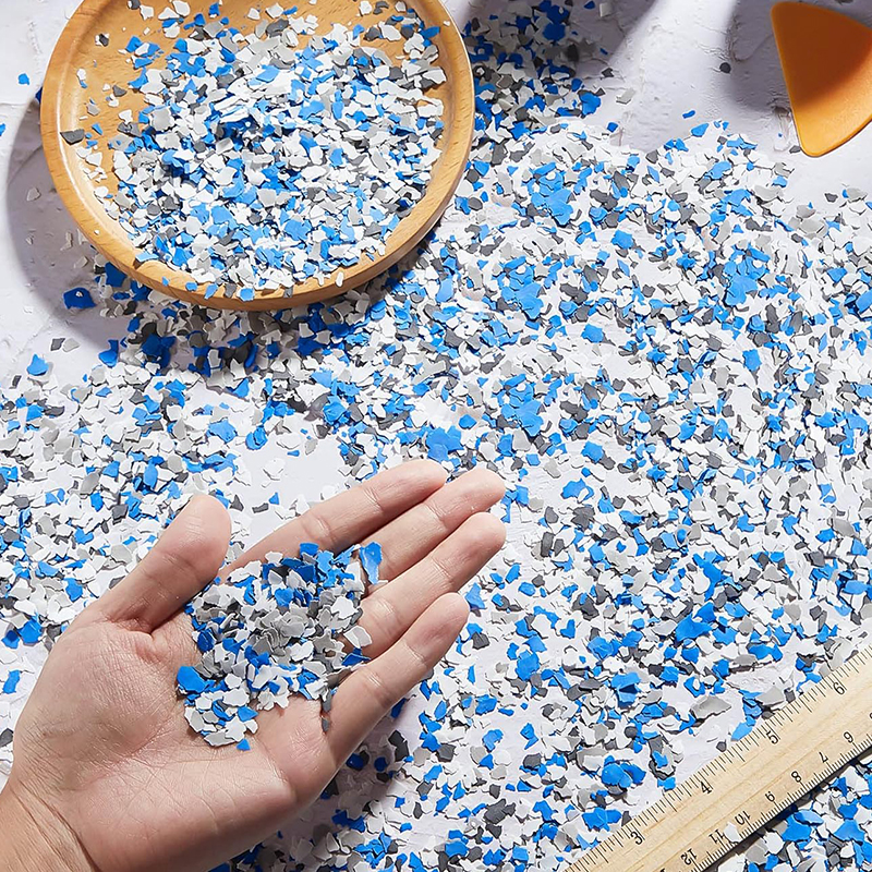 Our product uses high-strength composite rock flakes, a premium decorative aggregate commonly used in epoxy flooring. It creates the texture of natural granite and marble, while enhancing the performance of the floor, and is widely used in commercial, industrial and high-end residential applications.