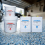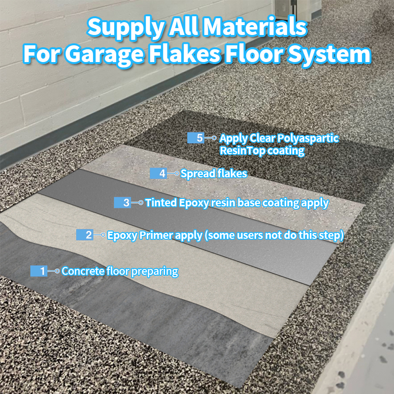 Tinted epoxy base coat is a 2 part epoxy resin ,100% solids ,mix ratio 2:1 by volume or weight , low VOCs, no toxic,solvent free,durable and strong adhension for the flakes, it has very good coloring ability , 0.3kgs per square meters is enough for coloring the concrete original color , different colors can be customized as requirements , and OEM packing and labeling are available ; Polyaspartic clear is also a 2 part resin .diifferent solids products for selection, mix ratio 1:1 for easy use,Low VOCs,Wear Resitant,Clear and seamless glossy finish,high strength, slip resistant and abrasion resistant,Yellow Resistant,good to use in doors or out doors floor coatings, it also can be top coatings for different area.