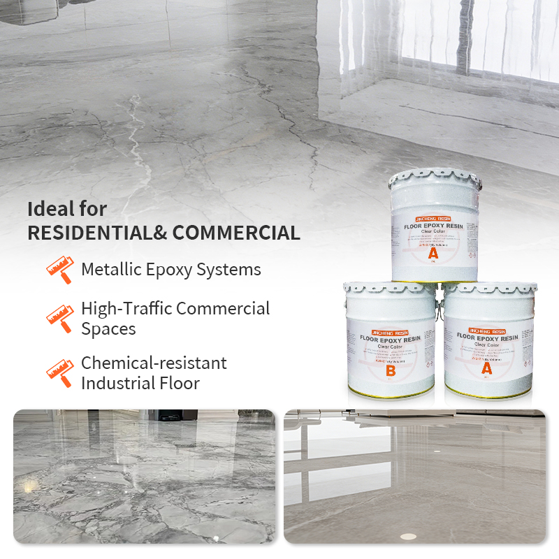 Marble epoxy flooring is one of the most popular and distinctive flooring types worldwide, and high-quality clear epoxy resin is the most critical component for marble epoxy flooring. Our marble epoxy flooring uses a 100% solids clear epoxy system. It features high transparency, self-leveling, yellowing resistance, solvent- free, and low VOC properties. It achieves a seamless mirror-like finish with no craters, high hardness, and scratch resistance. It is suitable for high-end commercial spaces and residential applications. Professional installation by a qualified construction team is recommended.